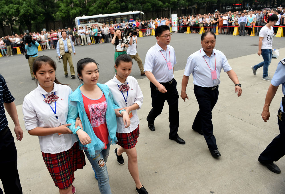 ↑ 2015年6月7日,王香君(左二)在安徽省合肥世界外国语学校考点志愿者及工作人员带领下进入考场。