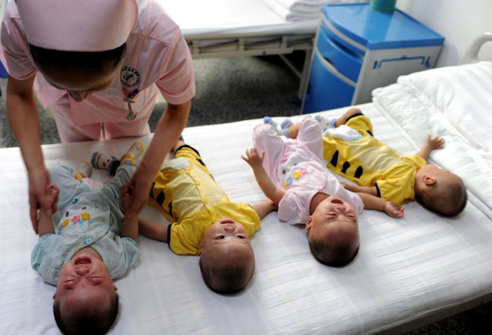 ↑ 2014年7月18日,在合肥一家医院的病房里,护士在查看四胞胎的身体状况。