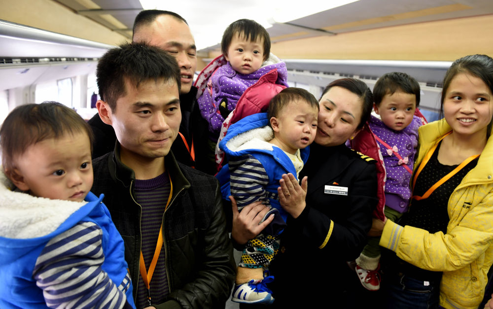 ↑ 2015年2月11日,四胞胎在G9242列车上与列车工作人员合影留念。