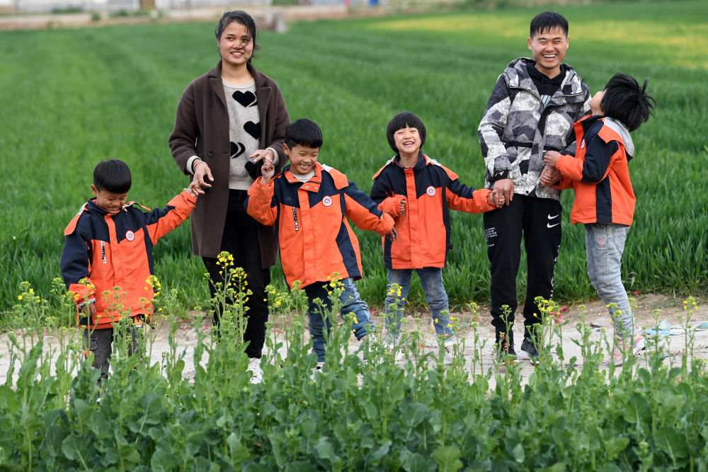 ↑ 2021年2月23日,常胜夫妻带着四胞胎在田野里玩耍。