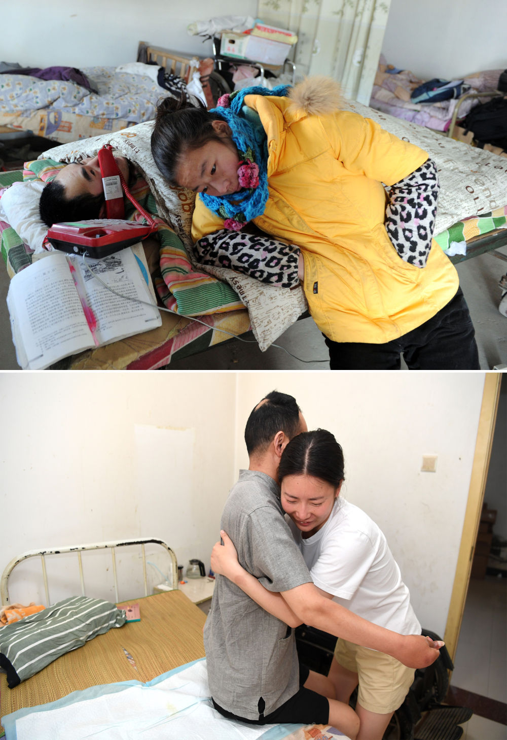 ↑ 拼版照片上图:14岁时的黄凤依偎在爸爸身旁听爸爸打电话(2011年1月1日摄);下图:2022年6月17日,黄凤抱爸爸起床准备外出。