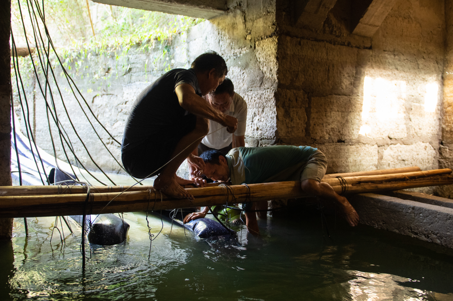 8月15日,在湖南省常德市桃源县热市镇郭家垭村,水利部门工作人员在取水点安装抽水机。新华社记者 陈思汗 摄