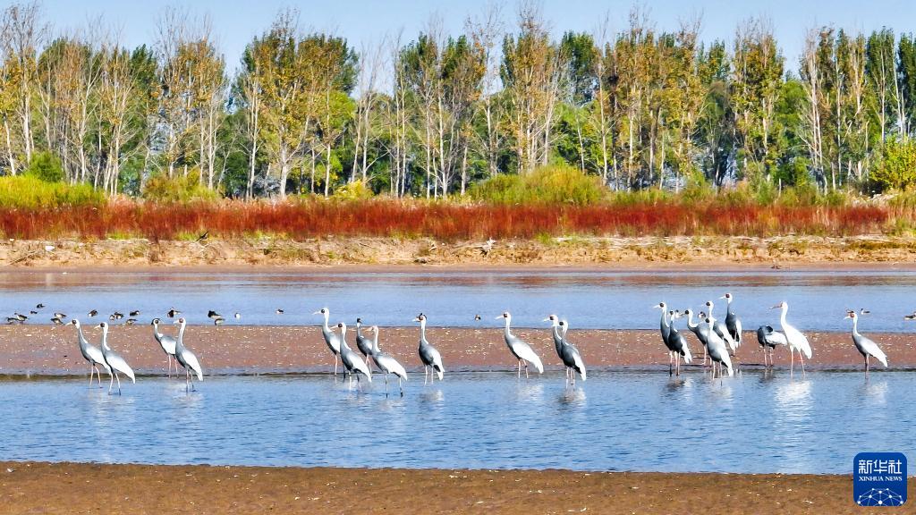 来到下游山东东营的黄河入海口,连片的盐地碱蓬火红如迎宾“红毯”,优雅的东方白鹳点缀其中。现在,黄河三角洲国家级自然保护区修复湿地20.6万亩,形成了“一次修复、自然演替、长期稳定”的良好湿地修复效果,生物多样性逐年提高,鸟类由建区时的187种增加到371种。黄河三角洲生态监测中心负责人刘静细数变化,“每年有数百万只鸟儿经由这里迁徙,其中一部分甚至在此越冬和繁殖”。