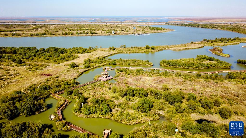 在山东黄河三角洲国家级自然保护区拍摄的湿地景色(无人机照片,2022年9月18日摄)。新华社记者 范长国 摄