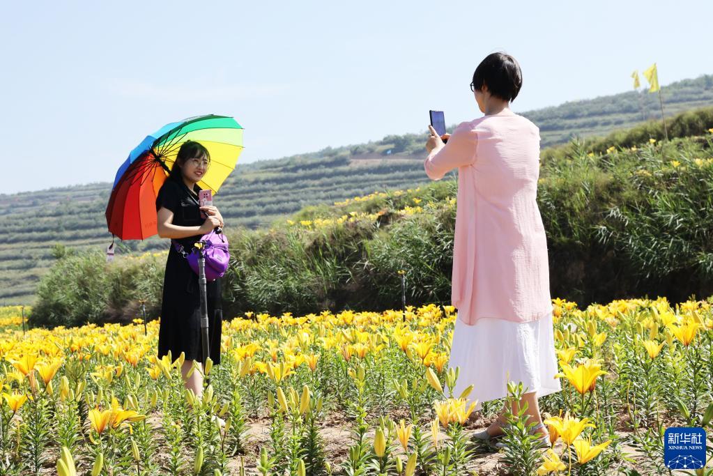 在宁夏固原市彭阳县金鸡坪梯田公园里,两名游客在百合花田拍照(2020年8月10日摄)。新华社记者 卢鹰 摄