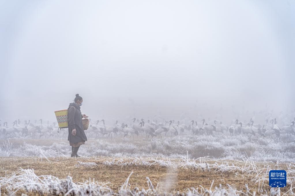 12月10日,陈光会在云南大山包黑颈鹤国家级自然保护区给黑颈鹤投食。