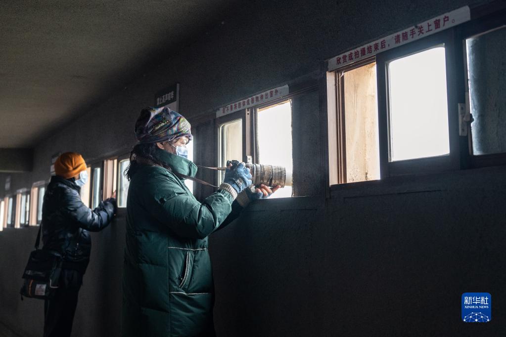 12月10日,观鸟爱好者在云南大山包黑颈鹤国家级自然保护区的地堡里观测黑颈鹤。