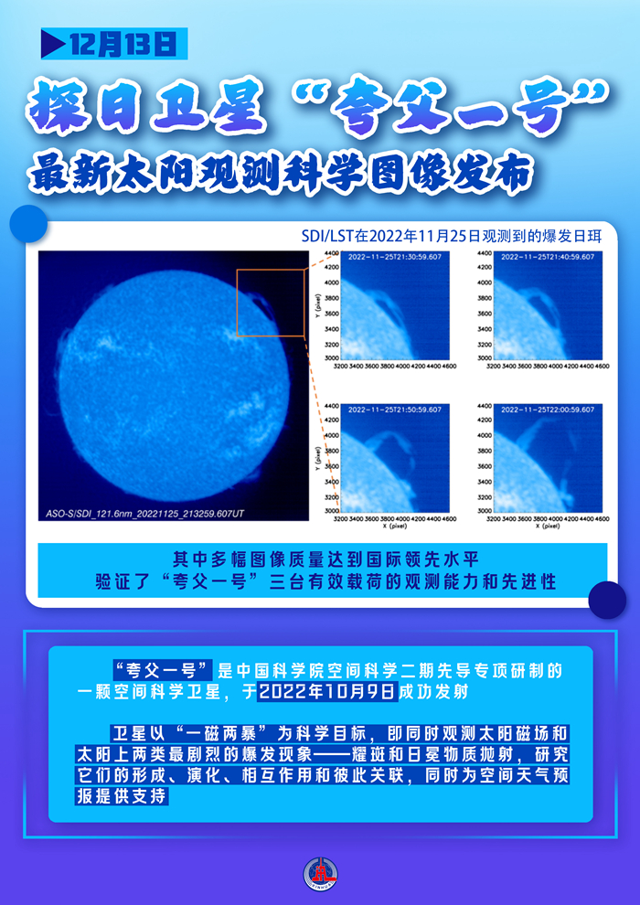 “夸父一号”是中国科学院空间科学二期先导专项研制的一颗空间科学卫星,于2022年10月9日成功发射。卫星以“一磁两暴”为科学目标,即同时观测太阳磁场和太阳上两类最剧烈的爆发现象——耀斑和日冕物质抛射,研究它们的形成、演化、相互作用和彼此关联,同时为空间天气预报提供支持。