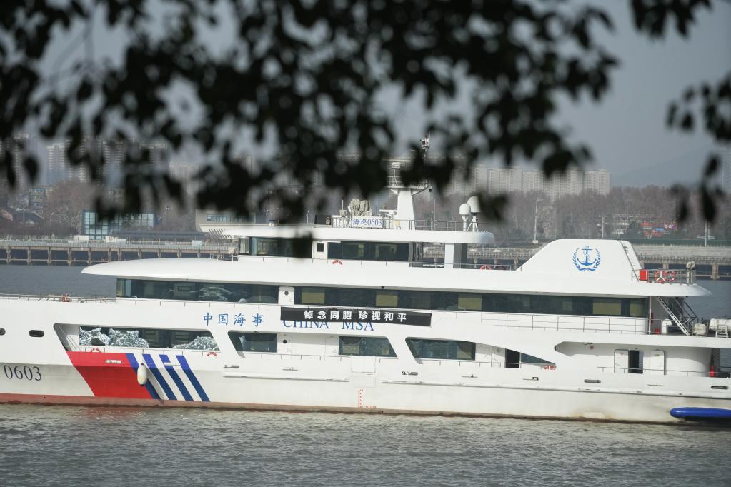 这是2022年12月13日侵华日军南京大屠杀中山码头遇难同胞纪念碑附近江面上参加悼念活动的船只。新华社记者 季春鹏 摄