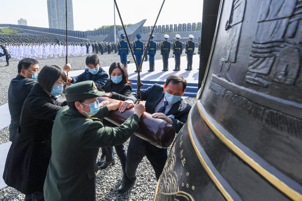 2022年12月13日,在南京大屠杀死难者国家公祭仪式现场,社会各界代表撞响“和平大钟”。新华社记者 李博 摄