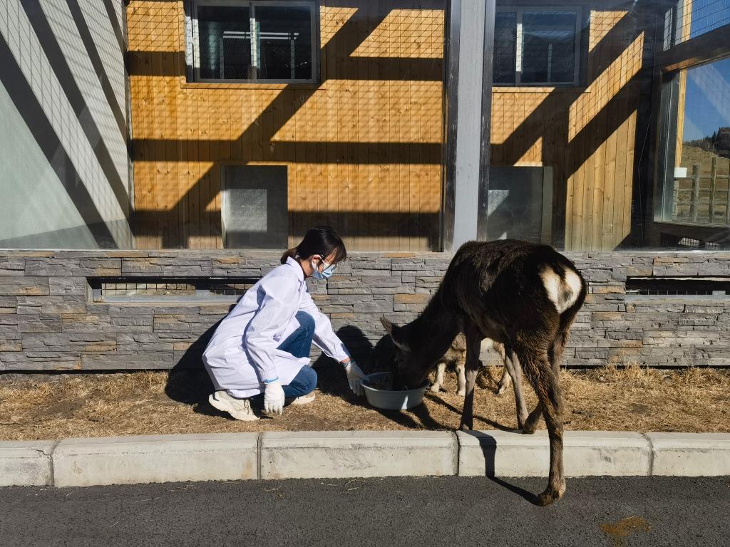 12月13日,张玉珍在基地给西藏马鹿喂食。(受访者供图)