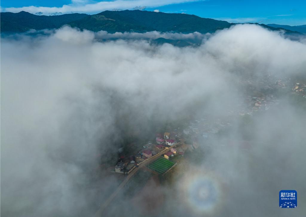 这是无人机拍摄的云雾间的云南省沧源佤族自治县龙乃村足球场(12月8日摄)。