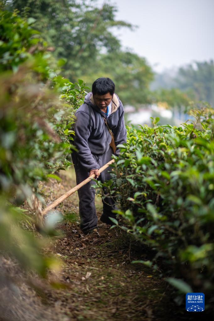 云南省沧源佤族自治县龙乃村首任足球队队长鲍志昆在茶地里劳动(12月7日摄)。