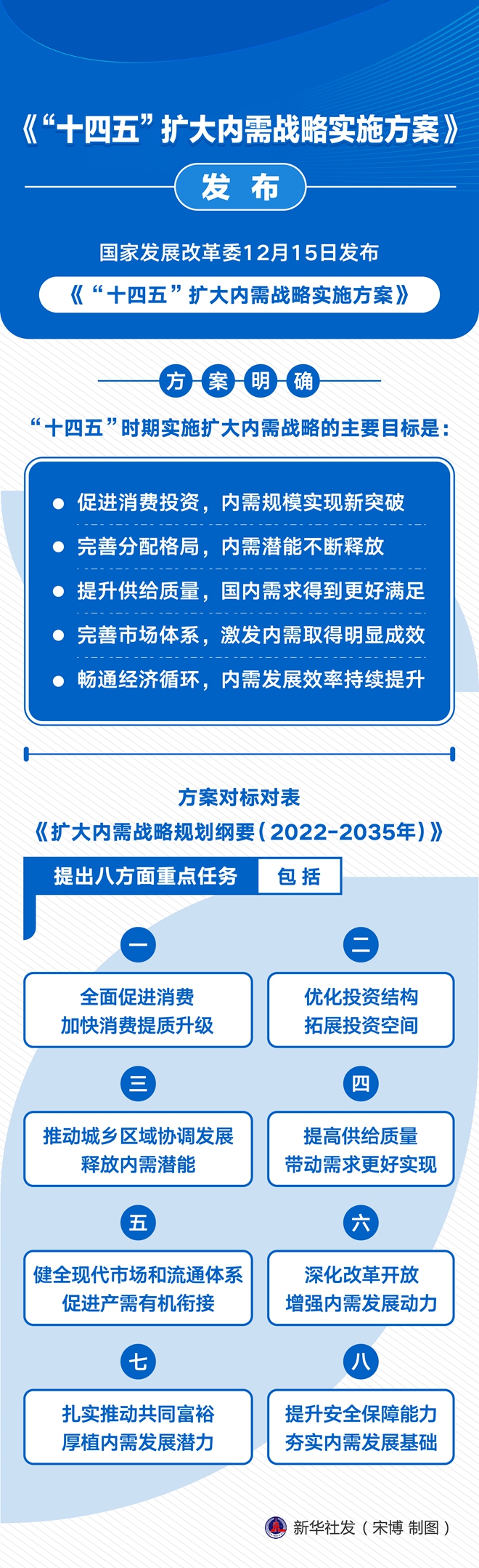新华社北京12月15日电(记者潘洁)国家发展改革委15日发布《“十四五”扩大内需战略实施方案》。实施方案针对制约扩大内需的主要因素,围绕“十四五”时期实施扩大内需战略主要目标,明确了重点任务和重要举措。