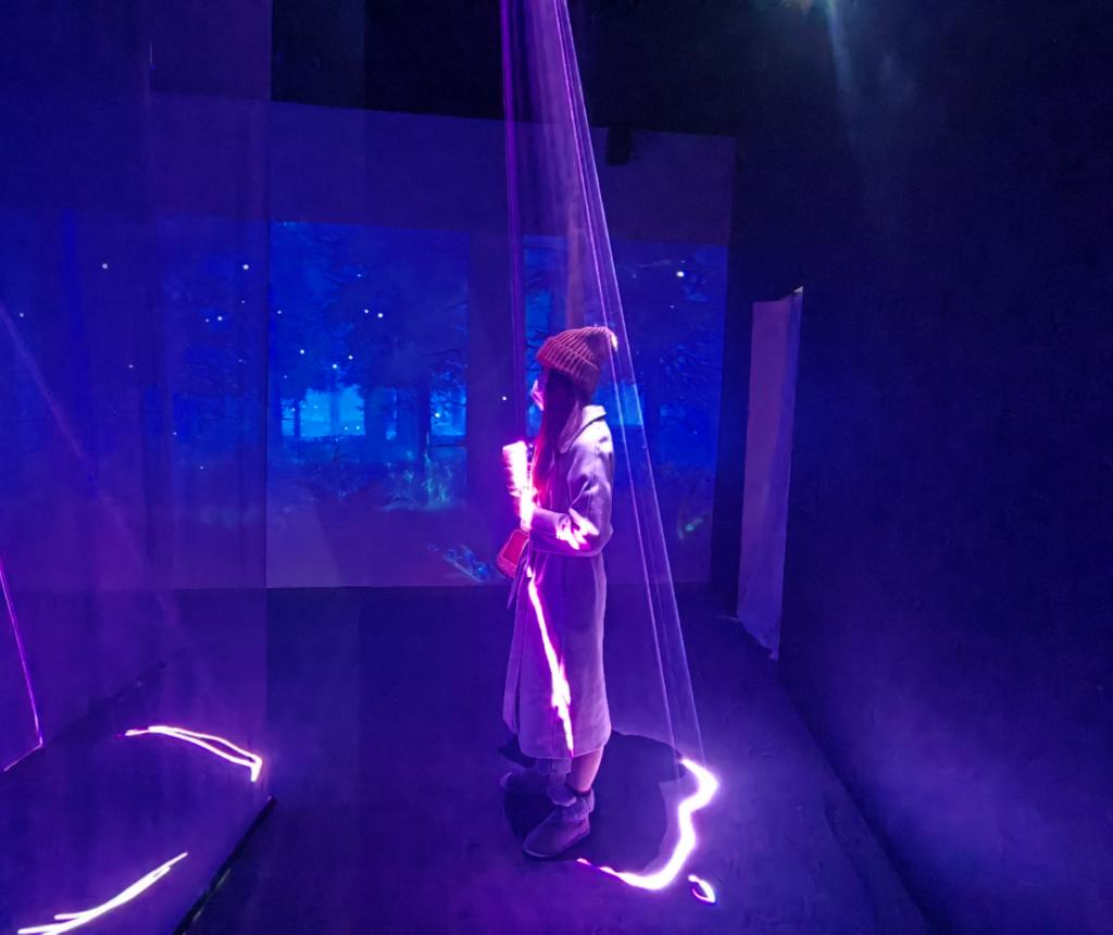 通过光影数字技术打造小说《三体》中的“黑暗森林”“三体宇宙”等经典场景,给观众带来沉浸式体验。该展览负责人、花生动画市场运营总监徐震晏告诉记者,文创产业与新技术的“跨界”融合,让大家仿佛置身于小说中,更能“感同身受”。