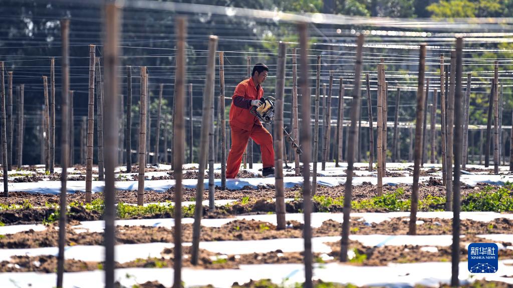 在钦州市三娘湾黄金百香果种植园,一名农民在搭建黄金百香果苗架(12月14日摄)。