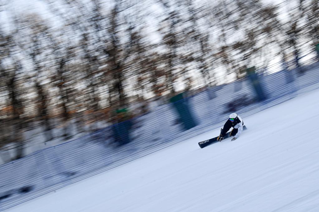 12月15日,在长春莲花山滑雪场,俄罗斯单板滑雪运动员进行赛前训练。新华社记者许畅摄