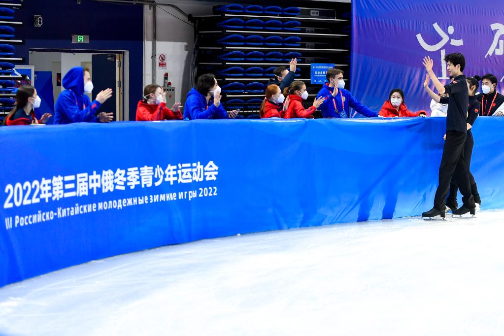在长春五环体育馆,俄罗斯花样滑冰运动员在场边为参加训练的中国运动员助威。(新华社记者许畅摄)