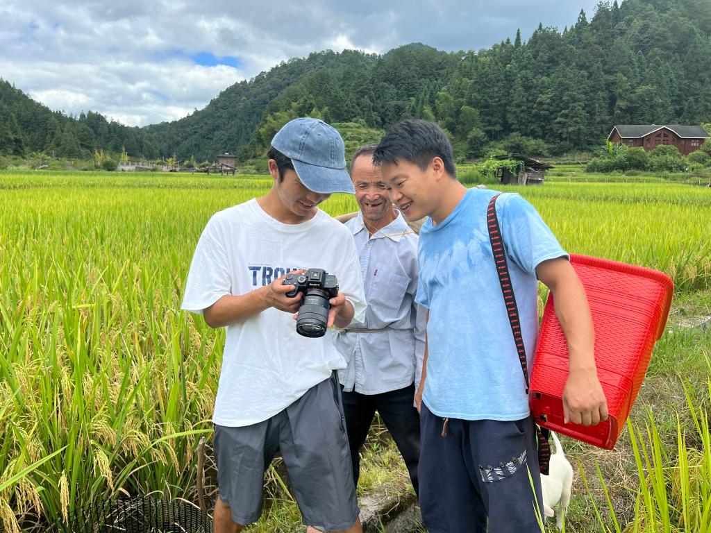 图为唐胜忠(右一)和团队成员在丹江村的田园中拍摄短视频。(受访者供图)
