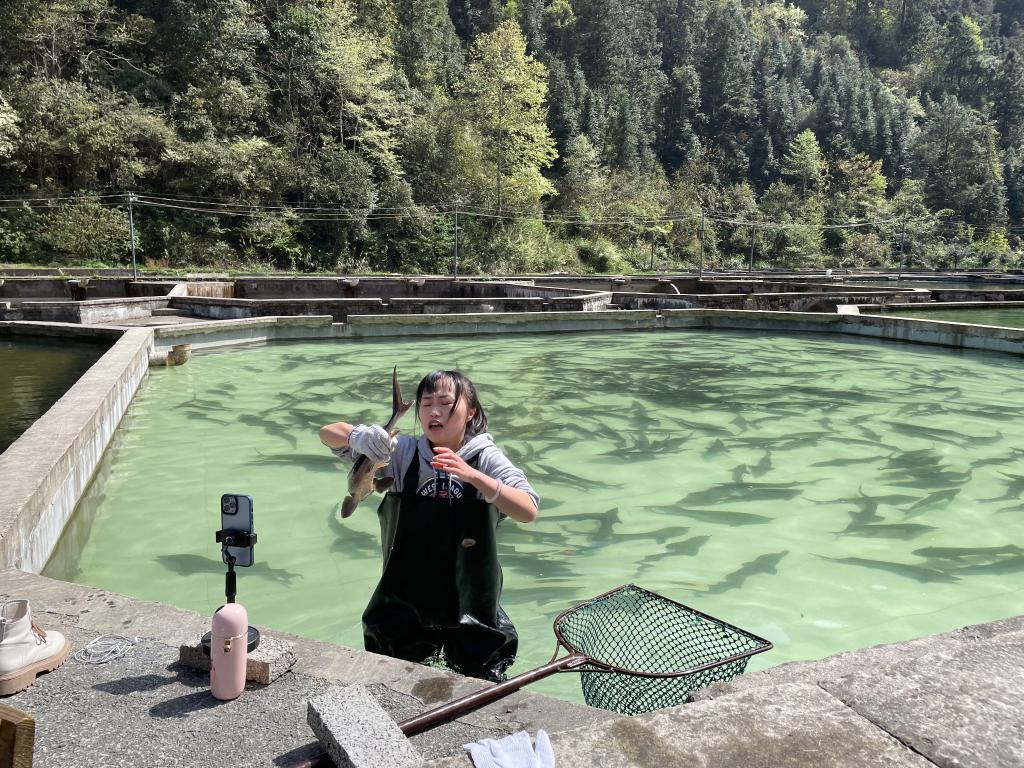 唐胜忠团队成员在丹江村中通过手机直播带货鲟鱼。(受访者供图)