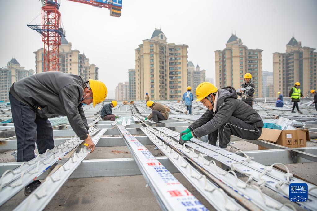 12月16日,在重庆市永川区西部科技影视基地项目,施工人员安装幕墙灯饰材料。
