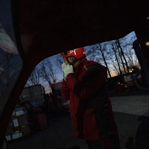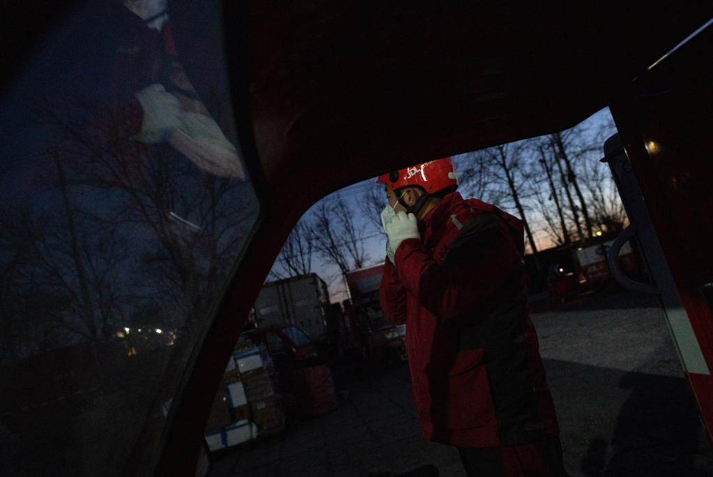 12月15日17时30分许,北京大兴,气温正向零下10摄氏度跌落。戴上手套、头盔,打开配送车顶灯,抵京还不到24小时的快递小哥齐帅龙出发了。