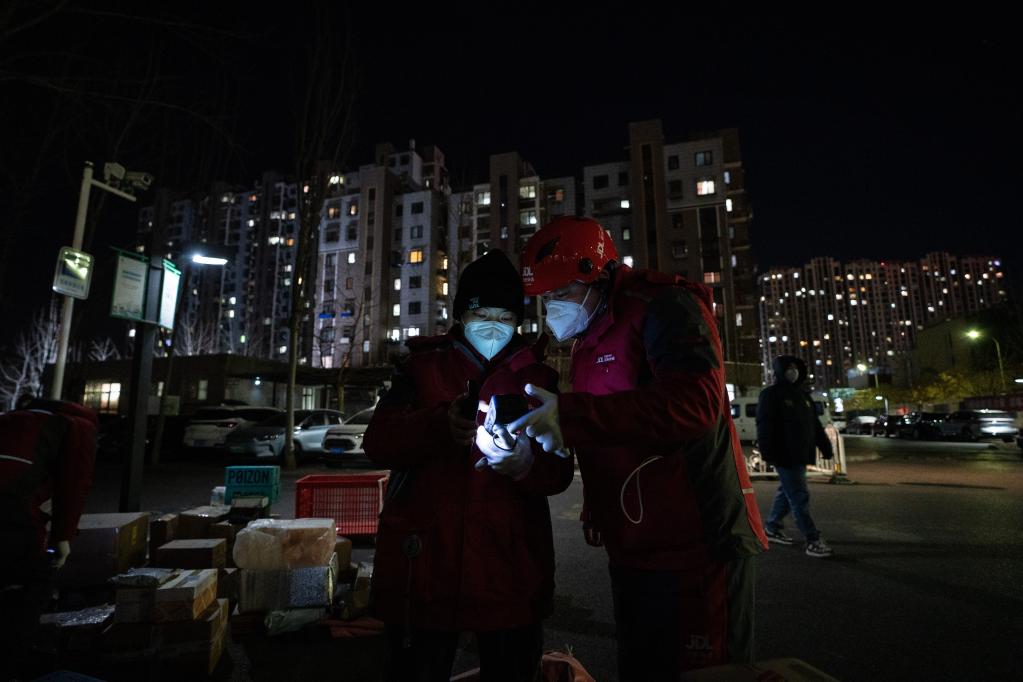 在北京市大兴区新源时代小区,从西安赴京支援的快递小哥齐帅龙(右)和高兴兴在核查配送信息(12月15日摄)。新华社记者陈钟昊 摄