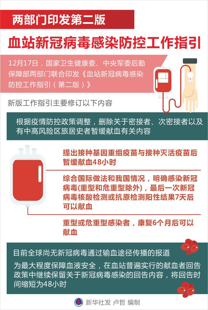 新华社北京12月17日电(记者顾天成、董瑞丰)血站新冠病毒感染防控工作事关血液安全平稳供应。17日,国家卫生健康委、中央军委后勤保障部两部门联合印发《血站新冠病毒感染防控工作指引(第二版)》,指导采供血机构切实做好新形势下疫情防控工作,保障血站工作人员和献血者安全,实现血液安全供应。