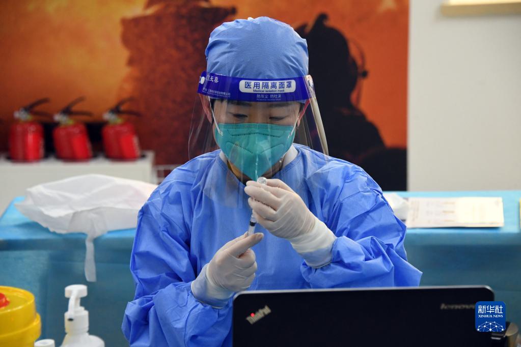 12月15日,在北京市海淀区花园路街道新冠疫苗接种点,医务人员进行新冠疫苗接种前准备工作。