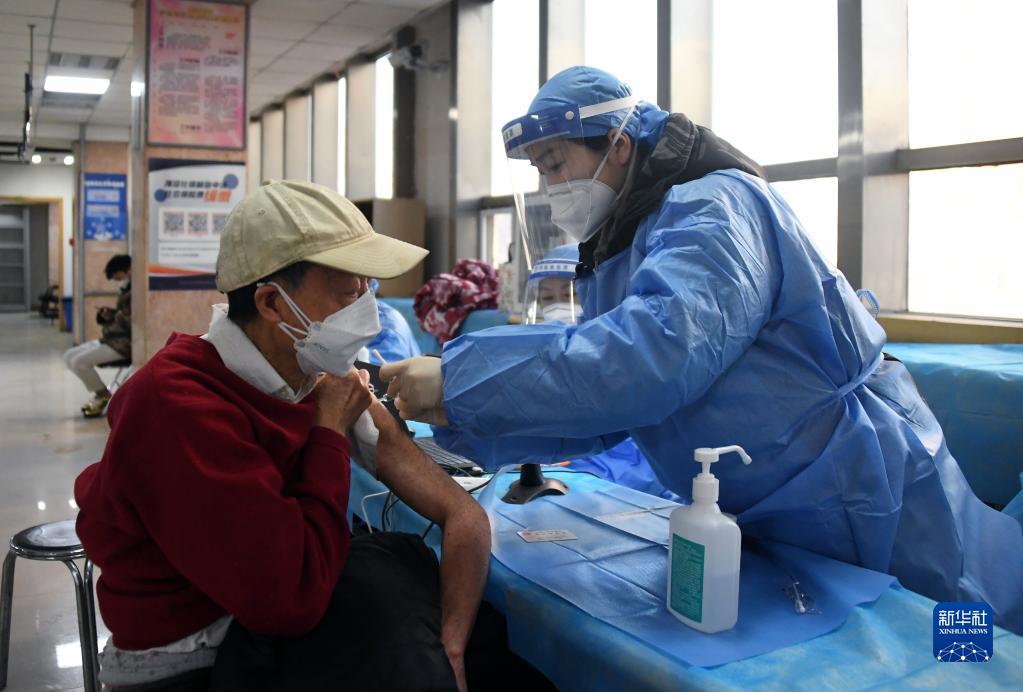 12月15日,在北京市海淀区中关村街道新冠疫苗接种点,医务人员为老年人接种新冠疫苗。