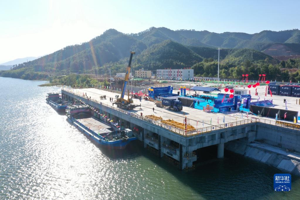 12月18日,“武夷2号”新能源货船停靠在南平港延平新城港区洋坑码头装运货物(无人机照片)。