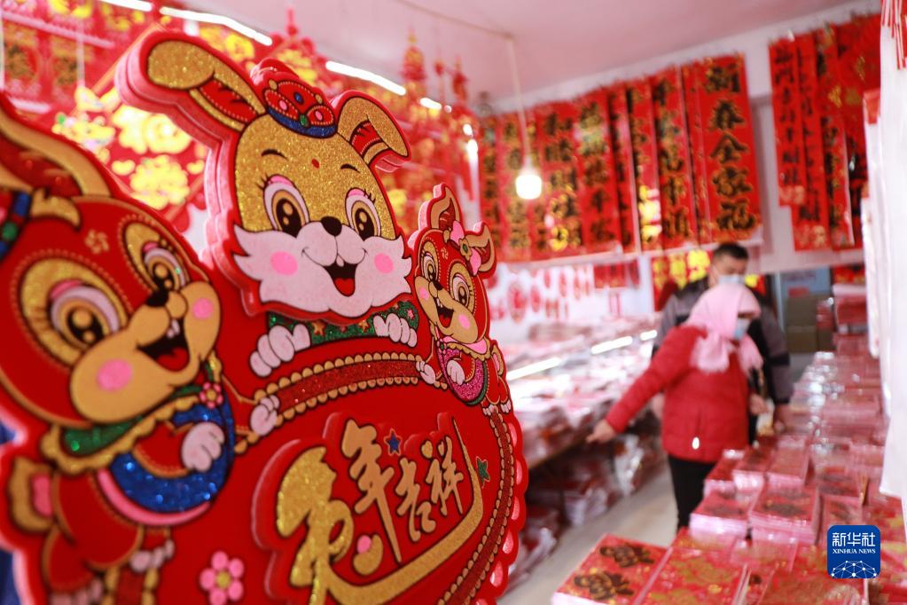 12月18日,在山东省高密市夏庄镇东李村春联批发销售点,客商在挑选春联产品。