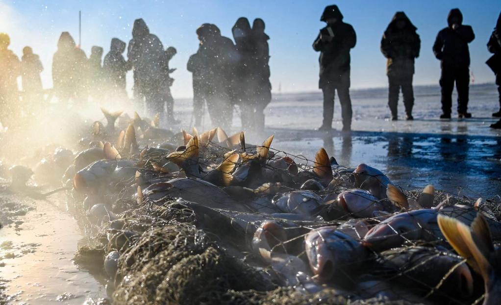 渔民从湖里打捞到查干湖冰面上的鱼(2021年12月26日摄)。新华社记者颜麟蕴摄