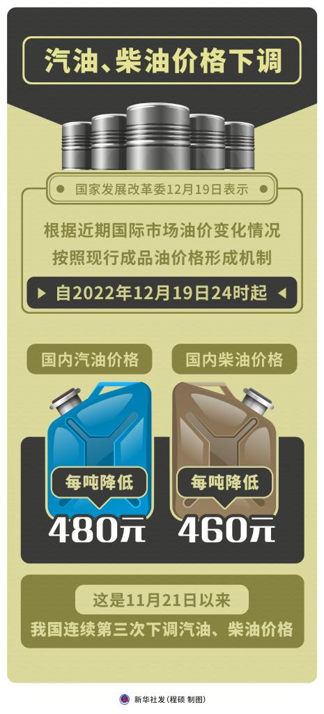 新华社北京12月19日电(记者潘洁)国家发展改革委19日表示,根据近期国际市场油价变化情况,按照现行成品油价格形成机制,自2022年12月19日24时起,国内汽油、柴油价格每吨分别降低480元和460元。