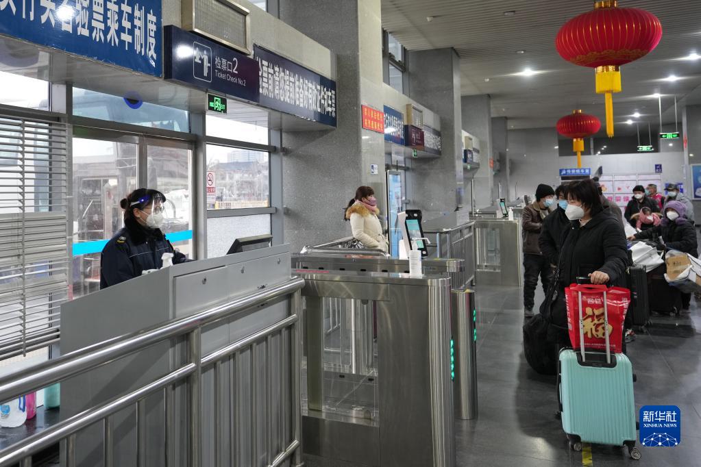 12月20日,在北京四惠长途客运站,旅客在排队等候检票乘车。