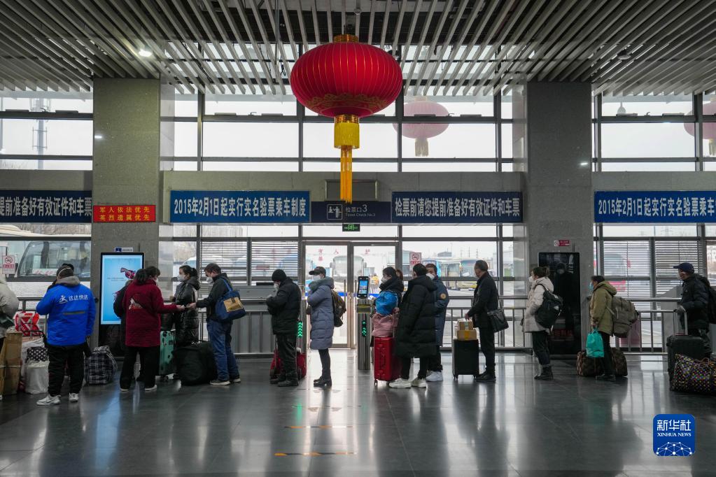 12月20日,在北京四惠长途客运站,旅客在排队等候检票。