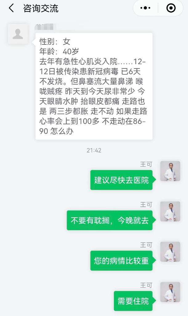 除了答疑,及时甄别出须尽快就医的患者也是线上问诊答疑的重要环节。就在前天晚上,王可收到一名新冠患者在线问诊,称“去年有急性心肌炎入院……今天尿非常少,眼睛水肿,心率上到100多,怎么办?”他当即回复:“建议尽快去医院,不要有耽搁,今晚就去。”收到建议后,该患者随即前往医院,目前正住院接受进一步治疗。