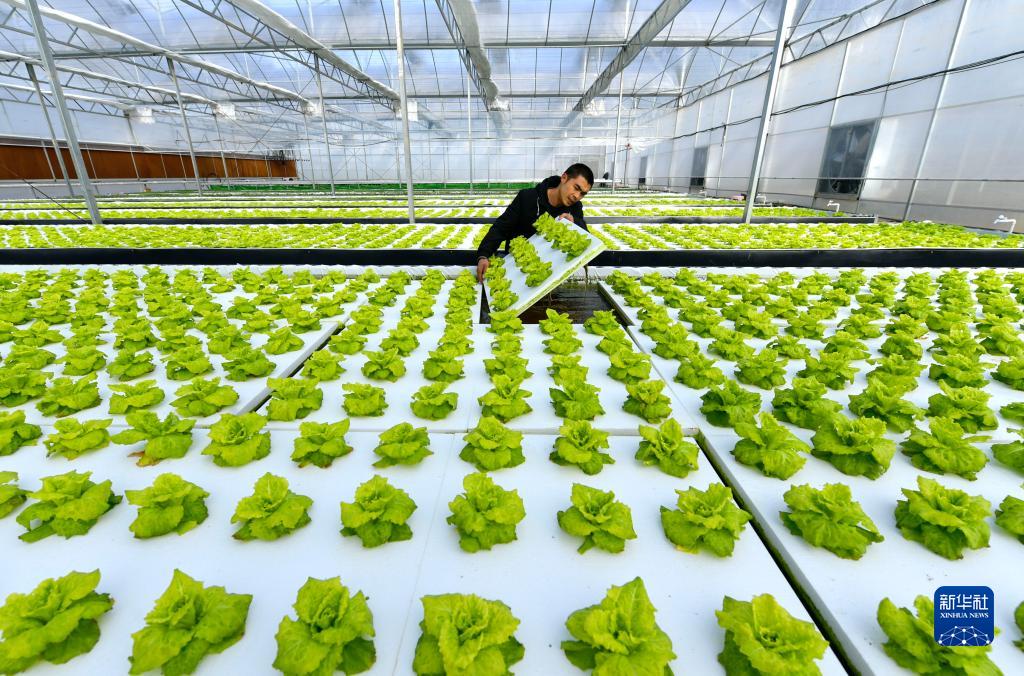 12月21日,菜农在湖北省宣恩县椒园镇锣圈岩村一处蔬菜温控大棚里管理水培蔬菜。