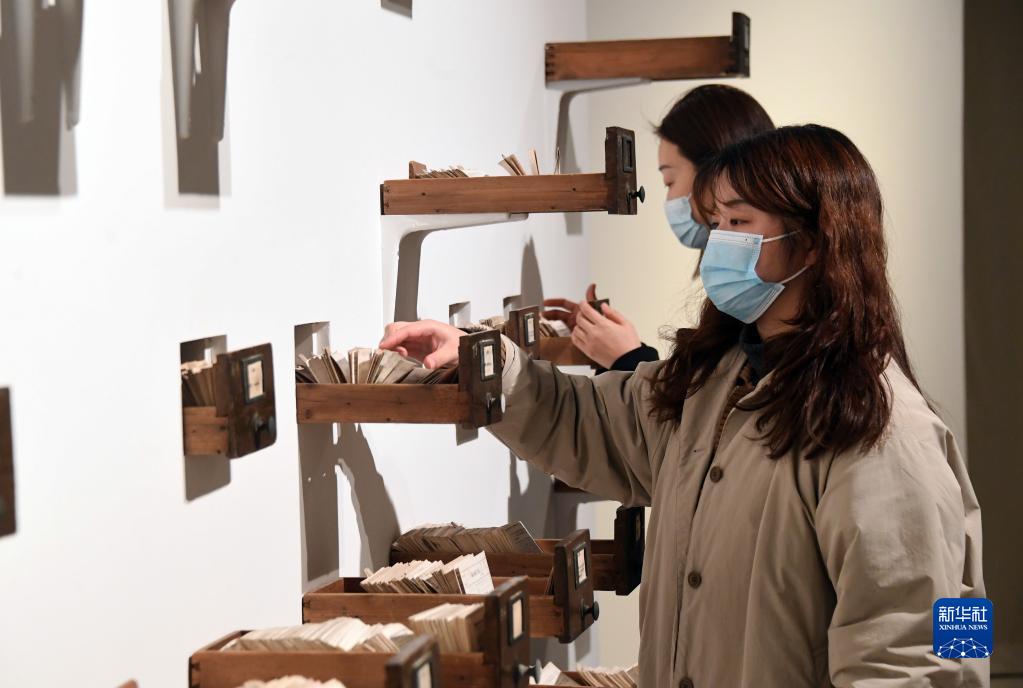 12月21日,在北京时代美术馆,观众在《声·生》当代艺术展中与艺术作品互动。