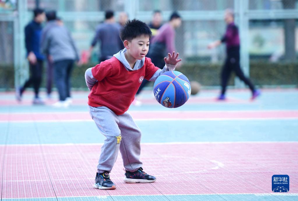 12月21日,一名儿童在石家庄市体育公园练习篮球。