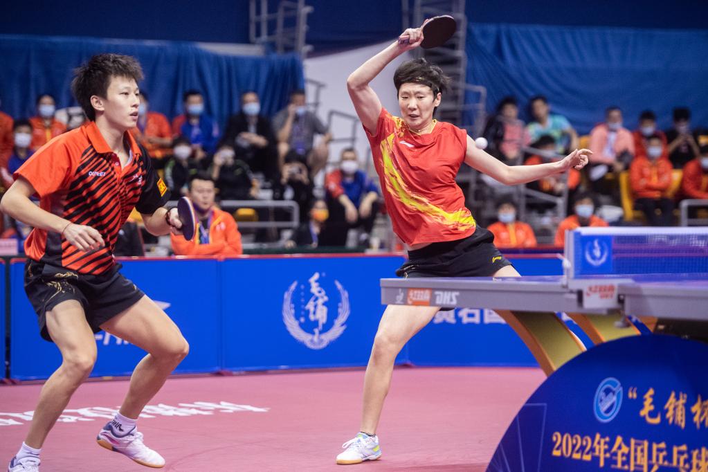 11月9日,林高远/王曼昱(右)在2022全国乒乓球锦标赛混合双打决赛中。新华社记者 伍志尊 摄