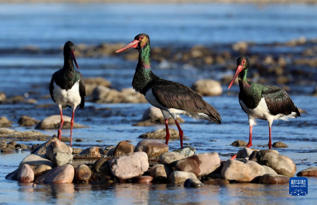 12月22日,三只黑鹳在河北省井陉县境内的绵蔓河休息。