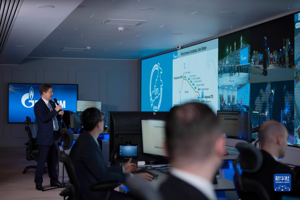 12月21日,在俄罗斯圣彼得堡,俄罗斯天然气工业公司总裁米勒(左一)在科维克塔天然气气田和“科维克塔—恰扬达”天然气管道投产通气仪式上与俄罗斯总统普京(未见于画面)和气田现场进行视频连线。新华社记者 孟菁 摄