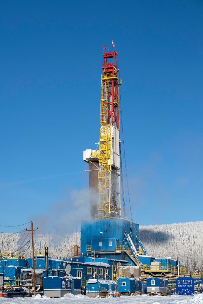 这是12月18日在俄罗斯伊尔库茨克州拍摄的科维克塔天然气气田钻井平台。新华社记者 孟菁 摄