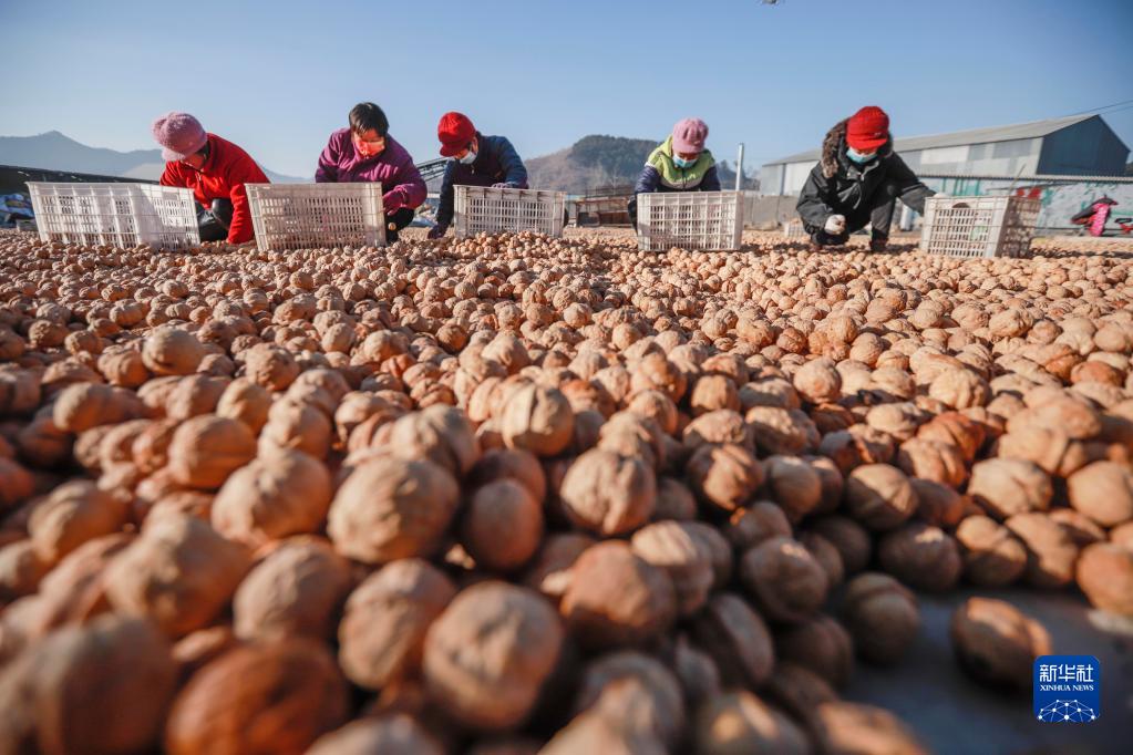 12月23日,农民在遵化市东旧寨镇石桥头村一家核桃专业合作社的场院精选核桃。