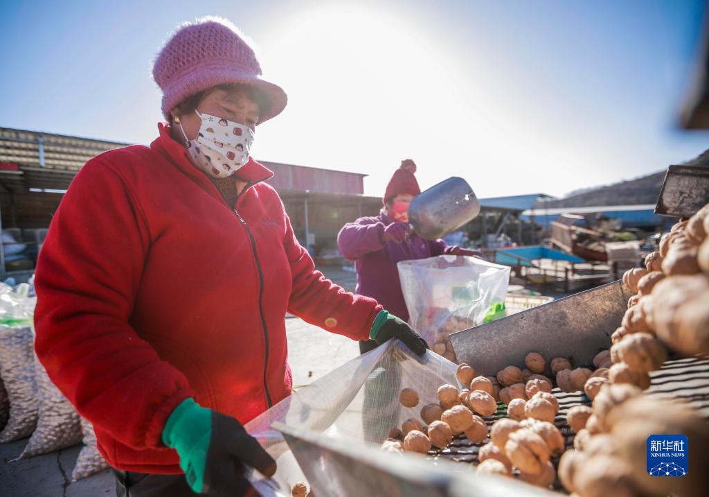 12月23日,农民在遵化市东旧寨镇石桥头村一家核桃专业合作社的场院装核桃准备外运。