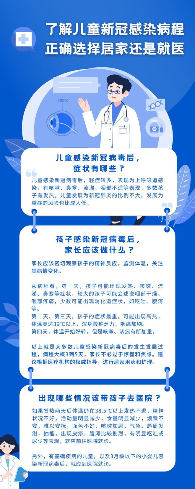 孩子感染了新冠病毒,家长格外焦虑,有的家长不分病情就抱着孩子往医院跑。重庆医科大学附属儿童医院的儿童感染病专家许红梅建议家长们,先认知儿童感染新冠的病程,再判断孩子的情况是宜居家还是该到医院就诊。