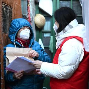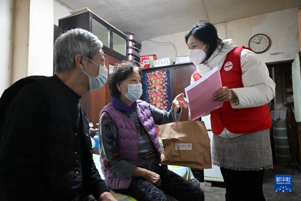 12月23日,在天津市和平区福明社区,社区工作者上门为困难人员发放“健康防疫包”。