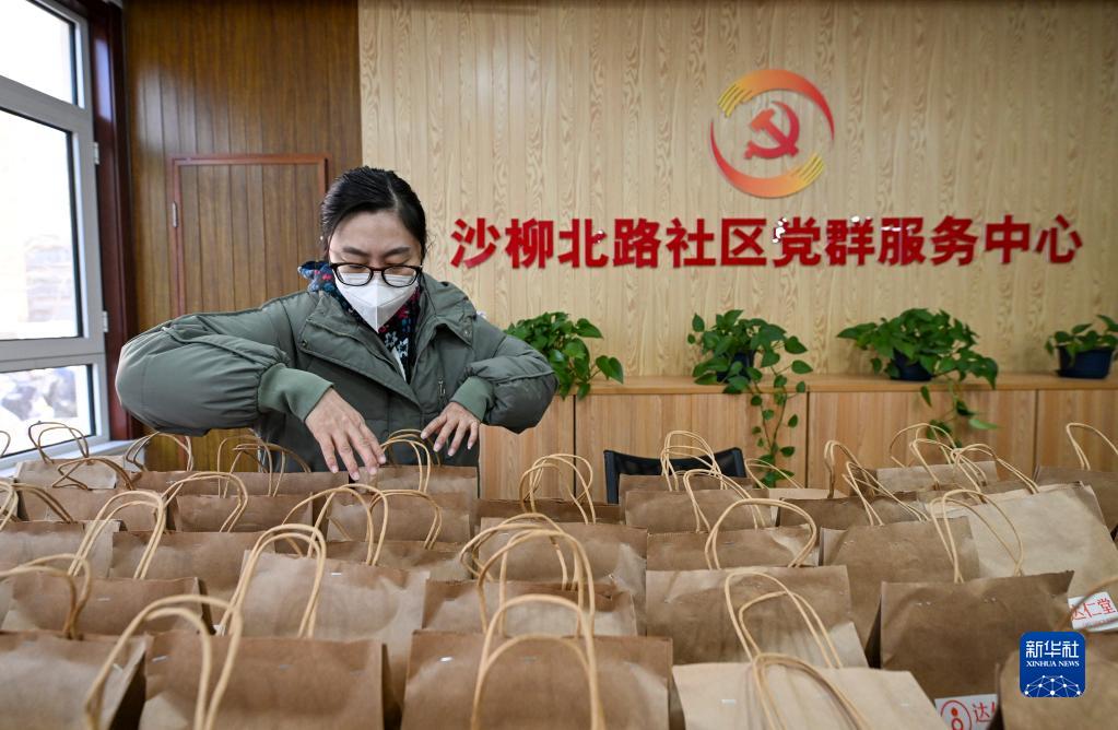12月23日,在天津市河东区东新街道沙柳北路社区党群服务中心,工作人员在盘点“健康防疫包”物资数量。