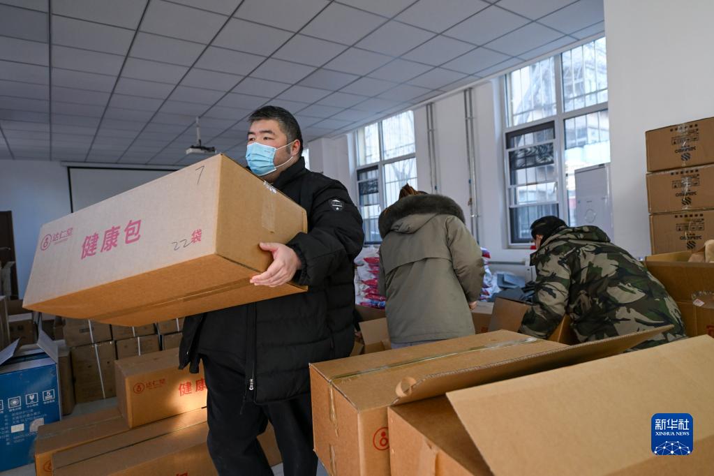 12月23日,在天津市河东区东新街道物资存放处,街道工作人员搬运“健康防疫包”。